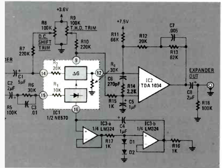Recomendado para aplicaciones de sonido estereofónico, este circuito fue encontrado en la revista Radio Electronics de abril de 1983. El circuito indicado es el NE570, lanzado en ese momento.