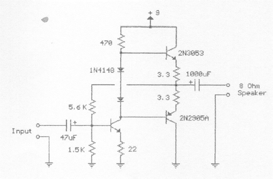 Este amplificador de transistores de baja potencia se encontró en documentación de los años 90. El circuito utiliza transistores de propósito general de la época y puede ser reemplazado por BC558 (PNP o BC548 (NPN). La corriente consumida es de 30 mA.