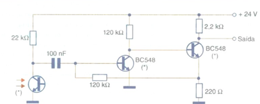 Un recurso para evitar la influencia de la luz ambiental, o incluso la acción de fuentes de luz externas sobre el circuito detector, es el uso de luz modulada. La señal resultante de un circuito sensor como se muestra en la siguiente figura es un tono de frecuencia igual al utilizado en la modulación, y se puede aplicar a un PLL para detección o a un circuito reconocedor de otro tipo, incluidos los que utilizan DSP. En el circuito indicado, el resistor de 22 k Ω en serie con el sensor se puede cambiar dependiendo de la sensibilidad deseada. El fototransistor utilizado debe ser del tipo elegido según la aplicación, pero en general los tipos comunes como el TIL78 permiten el funcionamiento con señales moduladas de hasta unos pocos cientos de kilohercios. El circuito completo para esta aplicación se encuentra en la figura.