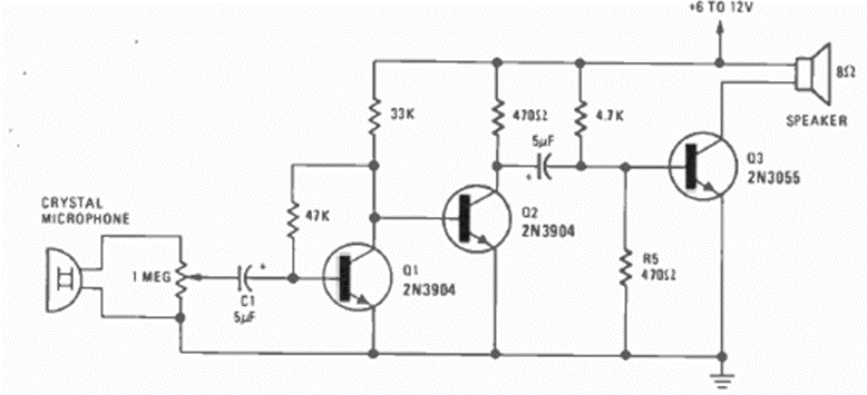 Este sencillo amplificador utiliza un micrófono conectado al teléfono. El circuito de 3 transistores se encontró en la revista Radio Electronics de mayo de 1977. La energía se puede suministrar mediante una fuente de alimentación o una batería.