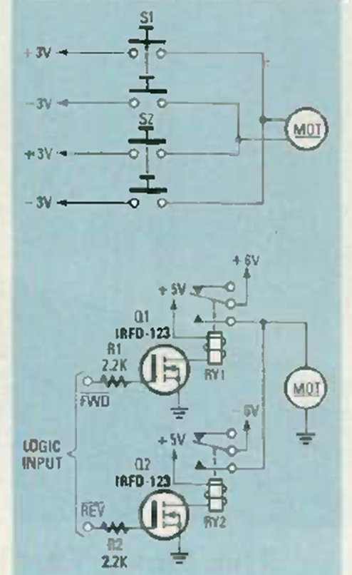 Este control lógico para motor fue encontrado en la revista Radio Electronics de septiembre de 1985. El relé está de acuerdo con el circuito lógico y el motor puede tener otras tensiones de alimentación.