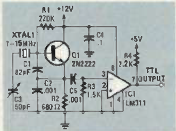Este circuito compatible con la lógica TTL se encontró en la revista Radio Electronics de diciembre de 1986. El cristal determina la frecuencia de la señal producida.
