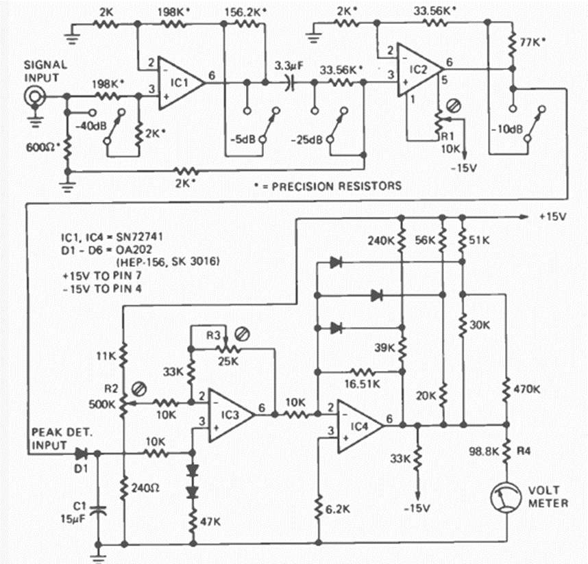 Hallado en la revista Radio Electronics de marzo de 1974, este circuito está destinado a medir el nivel de señales de líneas telefónicas con una respuesta de 3,6 kHz con 0 dB de referencia a 1 mW en una impedancia de 600 ohms.