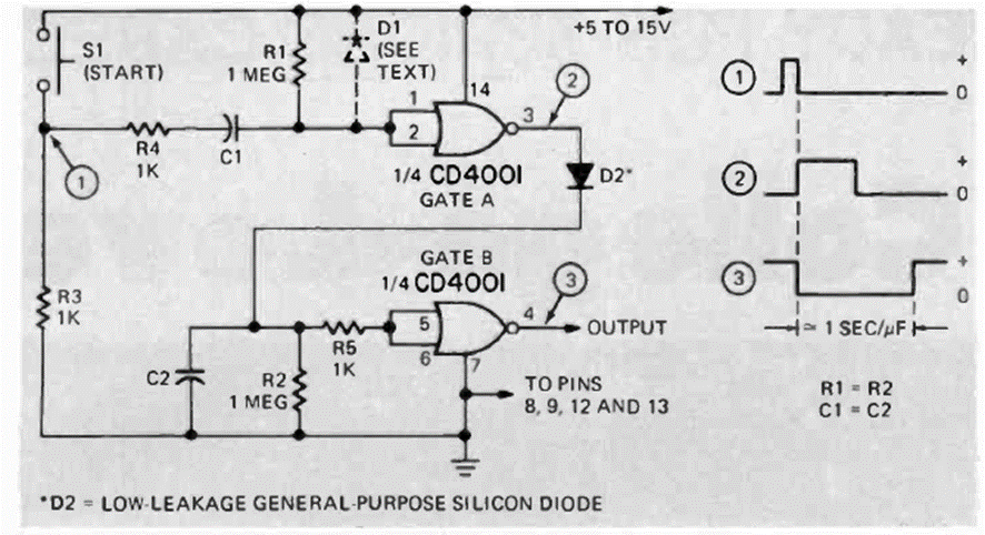 Este circuito lo encontramos en la revista Radio Electronics de noviembre de 1974. Los capacitores determinan el tiempo de salida y lo normal es obtener 1 segundo por cada uF utilizado.