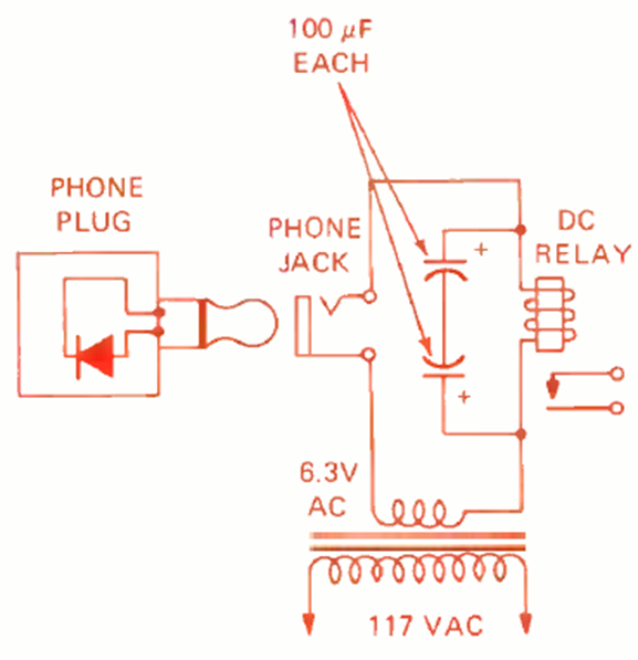 En este circuito, un conector con un diodo activa un relé en un sistema de seguridad. El circuito es de una revista de Radio Electronics. El relé depende del voltaje del transformador.