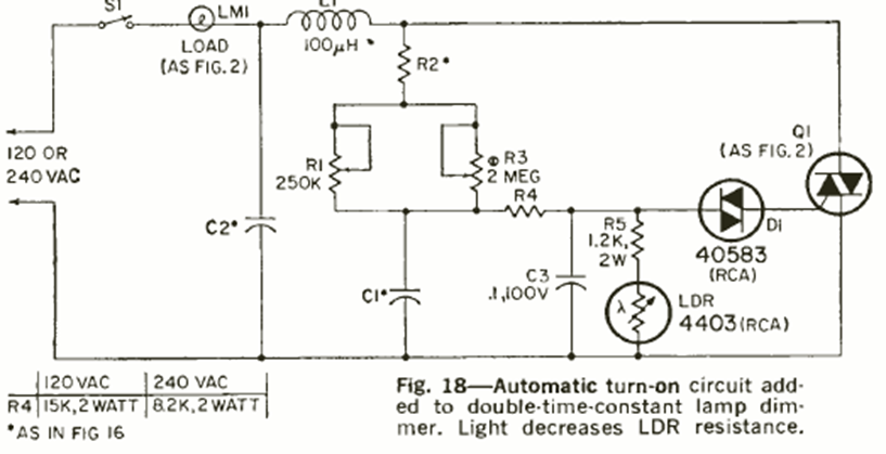 Este circuito se obtuvo de la revista Radio Electronics de julio de 1970. El circuito enciende una lámpara incandescente cuando la luz del sensor se atenúa o se corta. El triac está de acuerdo con la lámpara.