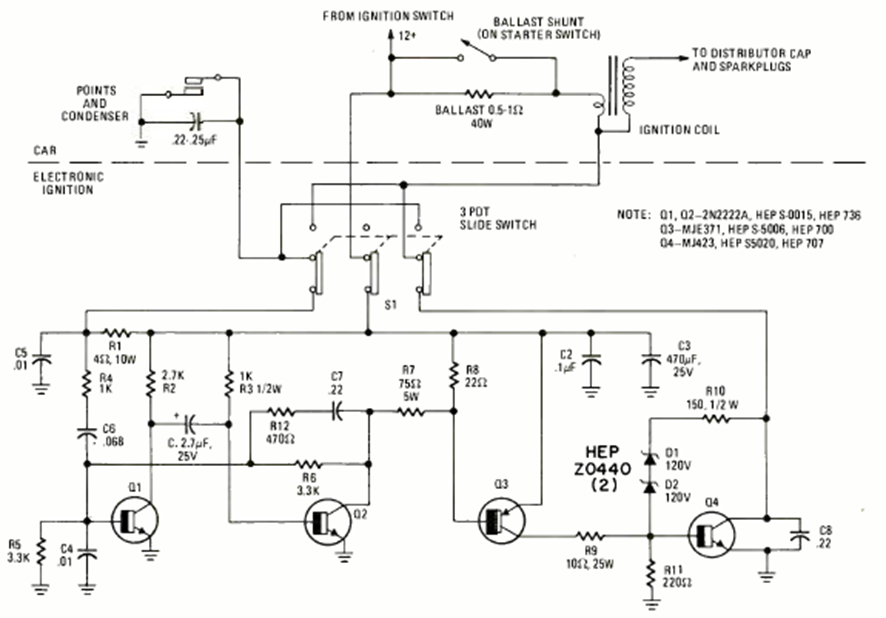 Este encendido electrónico para coches de la época fue encontrado en la revista Radio Electronics de mayo de 1976. El circuito utiliza transistores de potencia que deben montarse sobre disipadores de calor.