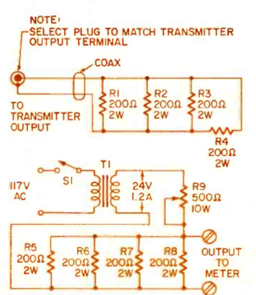 Este circuito es de una revista de Radio Electronics de diciembre de 1971. Las resistencias son tipos de potencia según la salida a medir. El indicador es un voltímetro analógico.