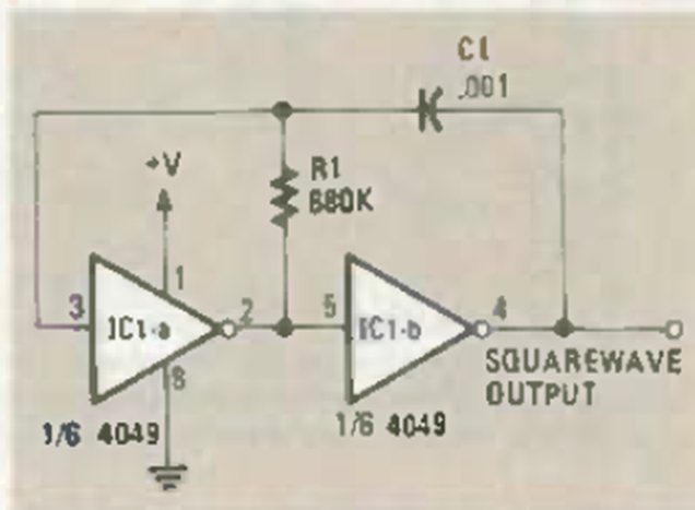 Encontrado en la revista Radio Electronics de noviembre de 1984, este circuito genera frecuencias que dependen de R1 y C1. La forma de onda es rectangular.