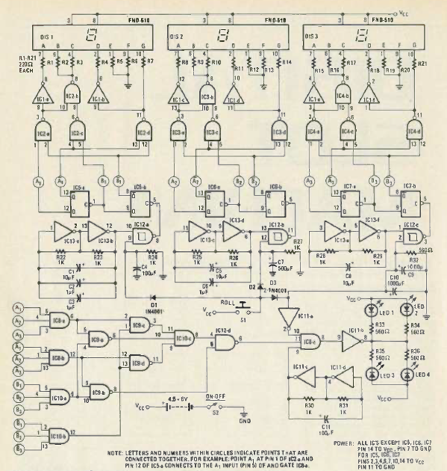 Este circuito fue encontrado en la revista Radio Electronics de enero de 1980. Es una “máquina tragamonedas” digital que utiliza circuitos lógicos comunes. Incluso hoy en día se puede montar fácilmente.