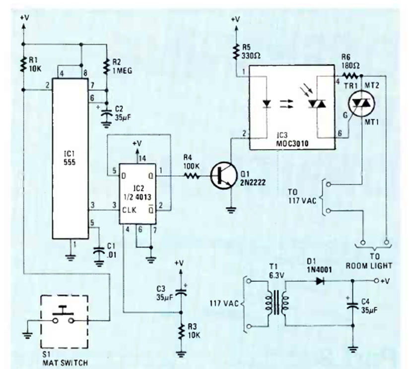 Usando un optoacoplador, este circuito enciende la luz de un dormitorio durante un tiempo determinado cuando alguien pisa el interruptor de presión debajo de la alfombra. El circuito es de una Radio Electronics de mayo de 1985.