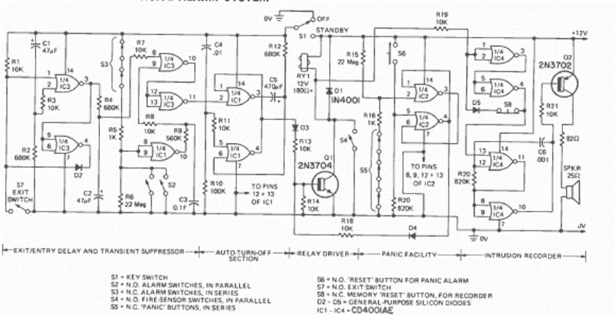Este circuito fue encontrado en un artículo de la revista Radio Electronics de mayo de 1975. El circuito tiene varias características y funciona con una fuente de 12 V o una batería.