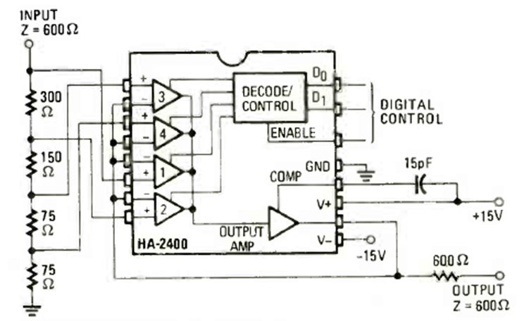 Este circuito utiliza un HA2400 que consta de 4 amplificadores operacionales controlados digitalmente. El circuito es de una revista de Radio Electronics de marzo de 1980. La fuente debe ser simétrica.