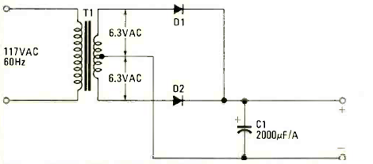 Esta fuente de tan solo 4 componentes tiene la configuración básica de onda completa. Los diodos dependen de la corriente y el voltaje del transformador determina la tensión de salida.