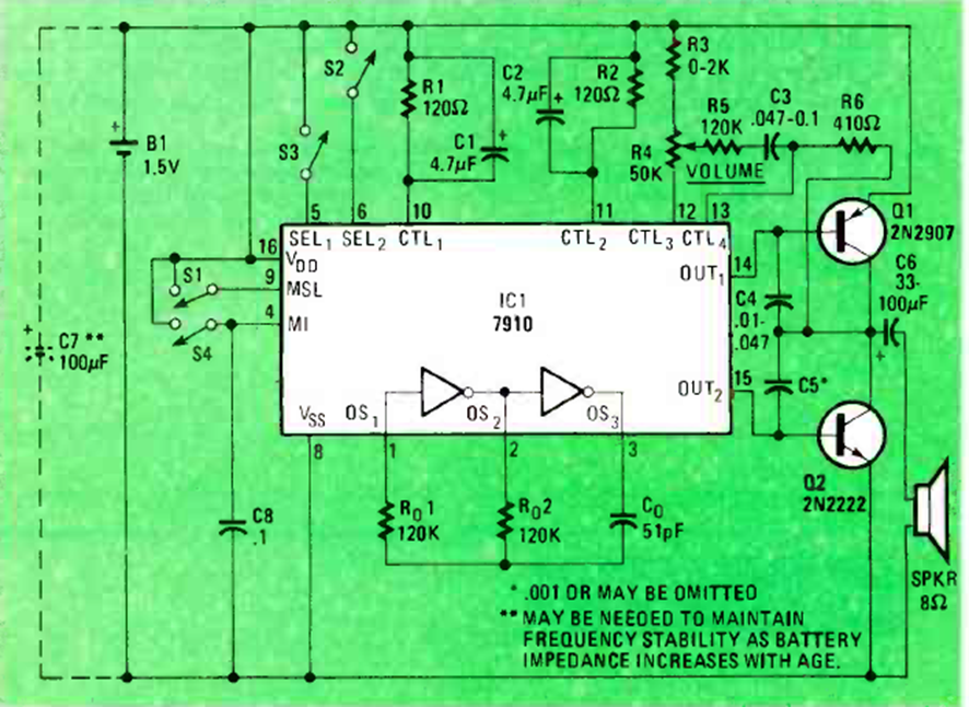 Este circuito fue encontrado en la revista Radio Electronics de marzo de 1982. El componente es un circuito especial que genera melodías programadas seleccionadas por los interruptores.