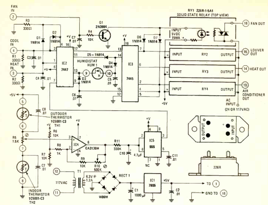 Encontramos este circuito de termostato múltiple en la revista Radio Electronics de julio de 1980. Utiliza opto-triacs en el control de potencia y opera en la red de 117 VCA.