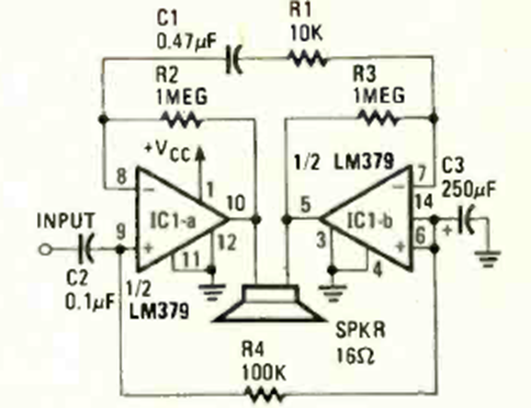 Este amplificador de audio puente fue encontrado en la revista Radio Electronics de julio de 1984. No se indica la fuente de alimentación y se debe consultar la hoja de datos.