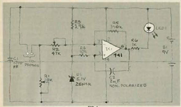 Este circuito de sensor de agua o humedad se encontró en la revista Radio Electronics de febrero de 1984. El circuito controla un LED, pero se puede modificar para controlar un relé.