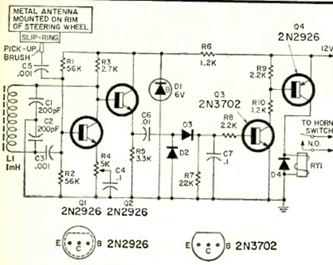 Este circuito de alarma de aproximación se encontró en Radio Electronics en septiembre de 1970. La bobina de 1 mH está enrollada en una varilla de ferrita. El relé es sensible a 12 V.