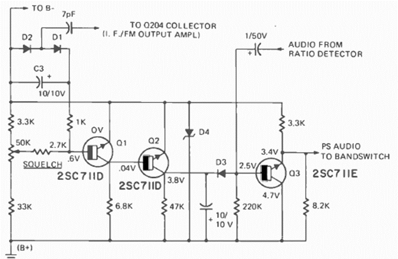 Este circuito para receptores de comunicaciones fue encontrado en la revista Radio Electronics de enero de 1974. Los transistores son del tipo japonés de la época, pues el circuito formaba parte de equipos de tal origen.