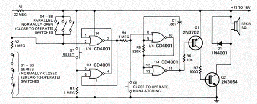 Esta alarma con sensores NO y NC fue encontrada en la revista Radio Electronics de enero de 1975. El circuito emite un sonido potente que depende del transistor de salida.