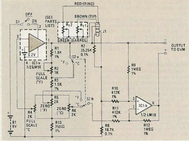 El rango de temperatura de este circuito es diferente al anterior, manteniéndose la misma configuración. El circuito es de una Radio Electronics de junio de 1985.