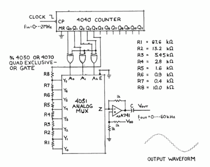 Encontramos este circuito generador de señales en la revista Radio Electronics de noviembre de 1978. El circuito emplea circuitos CMOS y tiene una frecuencia de entrada máxima de 2 MHz.