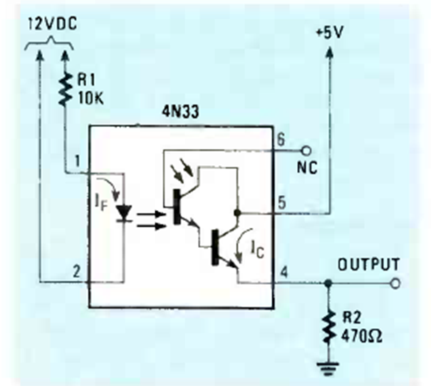 En la figura vemos cómo utilizar una señal de 12 V para activar un puerto TTL a través de un acoplador óptico. El circuito es de una Radio Electronics de mayo de 1985.