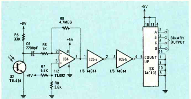 Este circuito deja de recibir señales del transmisor anterior. El circuito utiliza un fototransistor común. Fue encontrado en la revista Radio Electronics de agosto de 1984.