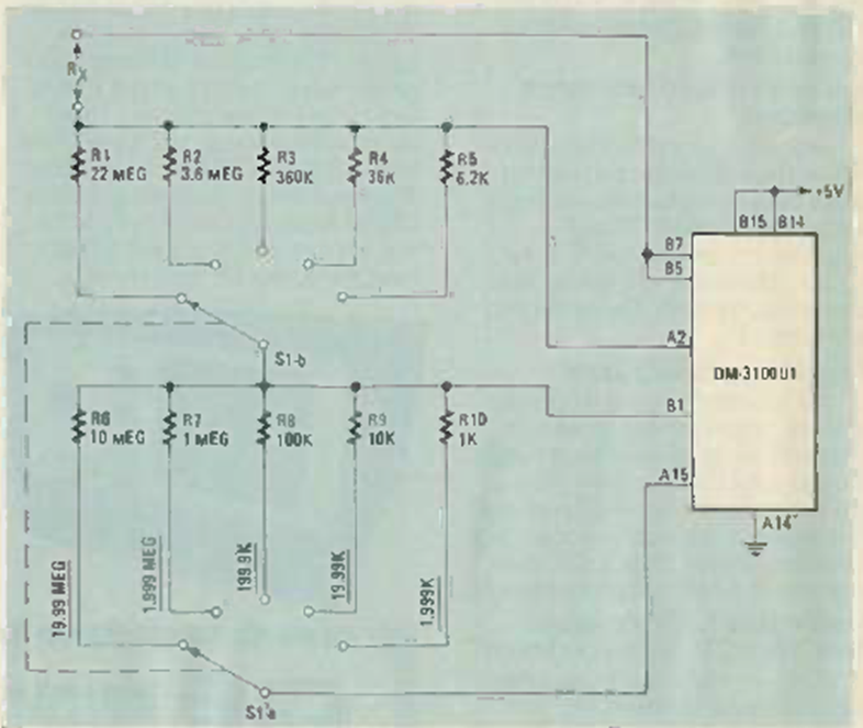 Este circuito medidor de resistencia fue encontrado en la revista Radio Electronics de febrero de 1984. Está basado en un módulo digital de la época. La fuente de alimentación es de 5 V.