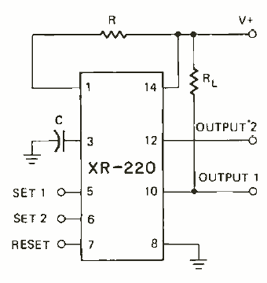 Este circuito integrado estaba destinado a competir con el 555 en los años 70. El circuito proporcionado es la versión básica que se encuentra en un artículo de la revista Radio Electronics de octubre de 1972. La fuente de alimentación suele ser de entre 3 y 15 V.