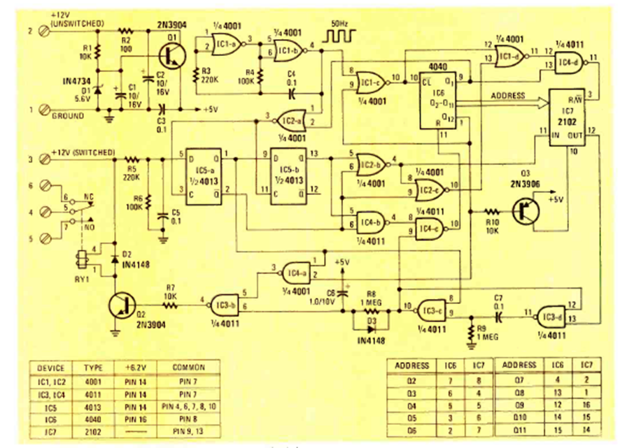 Este sofisticado circuito fue encontrado en la revista Radio Electronics de noviembre de 1978. Basado en lógica CMOS, tiene varios tipos de temporización, controlando el relé del limpiaparabrisas.