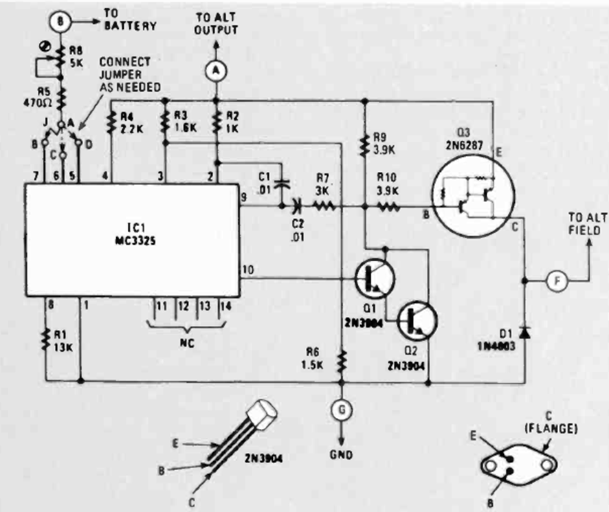 Este circuito fue encontrado en la revista Radio Electronics de junio de 1980. El circuito hace uso de un integrado de la época y de una potencia Darlington que debe estar equipada con un disipador de calor.