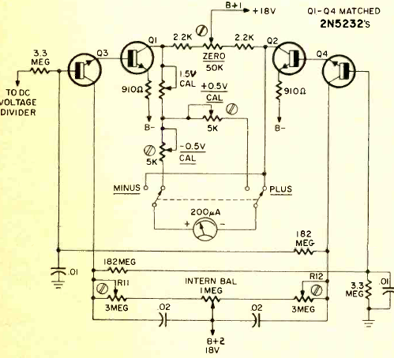 Este es el circuito de un instrumento comercial de alta impedancia, que apareció en la revista Radio Electronics de mayo de 1971. El circuito utiliza 4 transistores y funciona con 2 baterías de 9V.