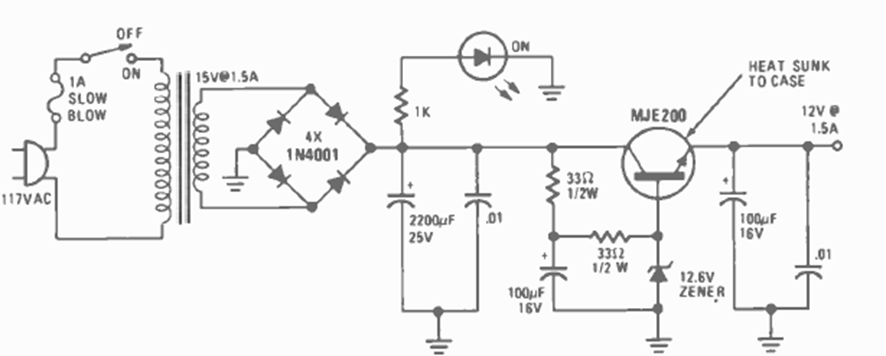 Esta fuente apareció en un artículo de la revista Radio Electronics de septiembre de 1977. Se recomienda para alimentar circuitos digitales. El transistor debe estar equipado con un buen radiador de calor.