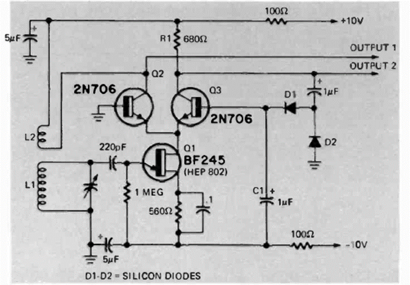 Este circuito con un par diferencial se encontró en la revista Radio Electronics de agosto de 1974. La frecuencia está determinada por L1 y el capacitor variable.