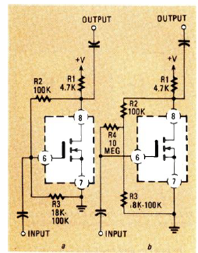 El circuito integrado 4007 consta de 4 MOSFET que se pueden utilizar por separado. La figura muestra cómo utilizar estos transistores en amplificadores lineales.