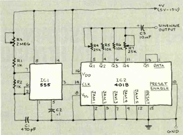 Este circuito aparece en varios puntos de esta sección desde diferentes fuentes y con variaciones. Esto es de Radio Eklectronics de agosto de 1984. La frecuencia se ajusta configurando el 555.