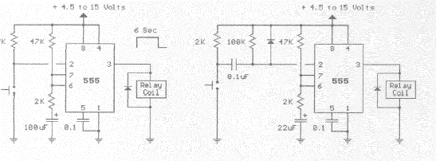 Este circuito se da en dos versiones, habiéndose encontrado en una publicación de los años 90. El segundo circuito se utiliza durante largos intervalos con la llave aislada, es decir, se apaga incluso después de completar el intervalo programado si la llave está encendida.