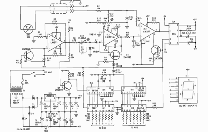 Este circuito fue encontrado en la revista Radio Electronics de septiembre de 1977. La fuente de alimentación está incluida y la lógica empleada es TTL.