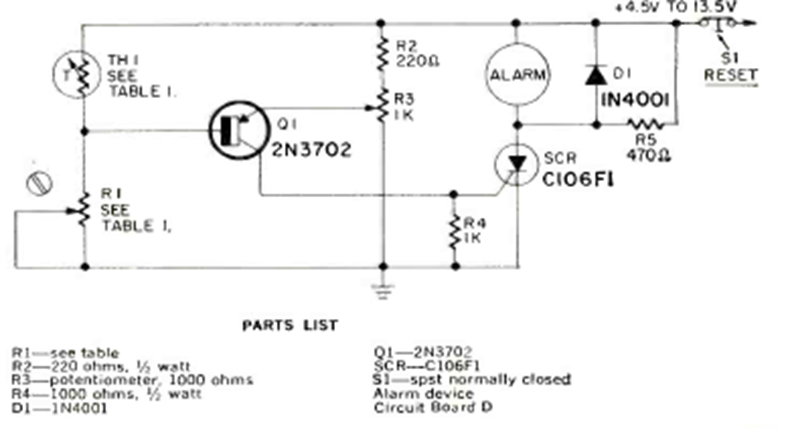 Encontramos este circuito en la revista Radio Electronics de septiembre de 1971. El sensor es un LDR y R1 ajusta la sensibilidad. Se puede utilizar un relé con la tensión adecuada en lugar del zumbador.