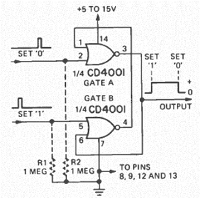 La configuración mostrada fue encontrada en la revista Radio Electronics de octubre de 1974. El integrado utilizado es el CD4001 y la alimentación depende de la aplicación.