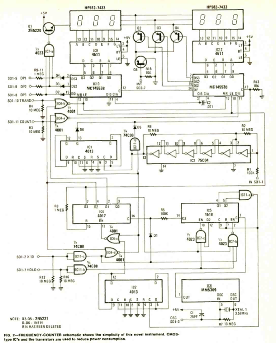 Encontramos este circuito en la revista Radio Electronics de octubre de 1978. El artículo de la revista describe su montaje. El circuito tiene 6 dígitos y utiliza componentes de período.