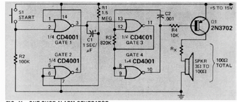 Esta sirena de alarma de dos tonos fue encontrada en la revista Radio Electronics de enero de 1975. Se puede cambiar el transistor de potencia y con él Rx que tiene valores de 10 a 47 ohms.