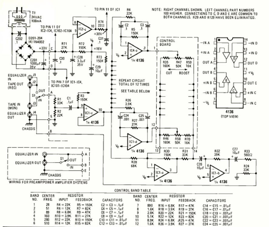 Este ecualizador se encontró en la revista Radio Electronics de mayo de 1978. Los valores de los componentes de las redes de ecualización se dan al lado del diagrama.