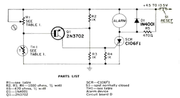 Este circuito lo encontramos en la revista Radio Electronics de septiembre de 1971. El SCR puede ser cualquiera de la serie 106 y el zumbador se puede sustituir por un relé según la tensión de alimentación.