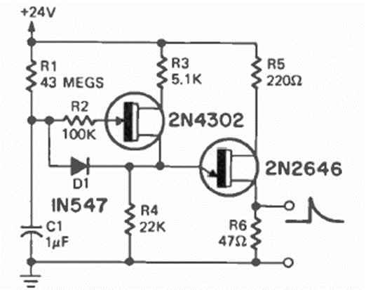 Este circuito para retrasos prolongados se encontró en la revista Radio Electronics de julio de 1973. El capacitor determina el retraso. El transistor unijuntura es bien conocido y el transistor bipolar puede ser cualquier FET de propósito general.