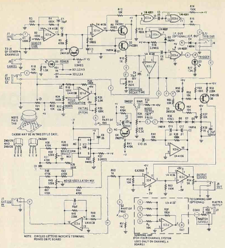 Este sofisticado sintetizador de sonido de batería apareció en la revista Radio Electronics en mayo de 1980. El circuito se basa en circuitos integrados comunes y su salida debe conectarse a un amplificador.