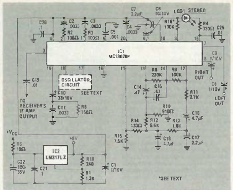 Este circuito para decodificar señales AM estéreo QUAM, sistema poco desarrollado, fue encontrado en la revista Radio Electronics en enero de 1984. Utilizaba un circuito integrado de Motorola especialmente desarrollado para este fin.