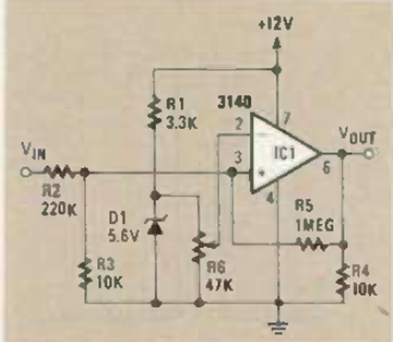 Este circuito con acción regenerativa fue encontrado en la revista Radio Electronics de junio de 1986. Utiliza un CA3140 y tiene como referencia un diodo zener.
